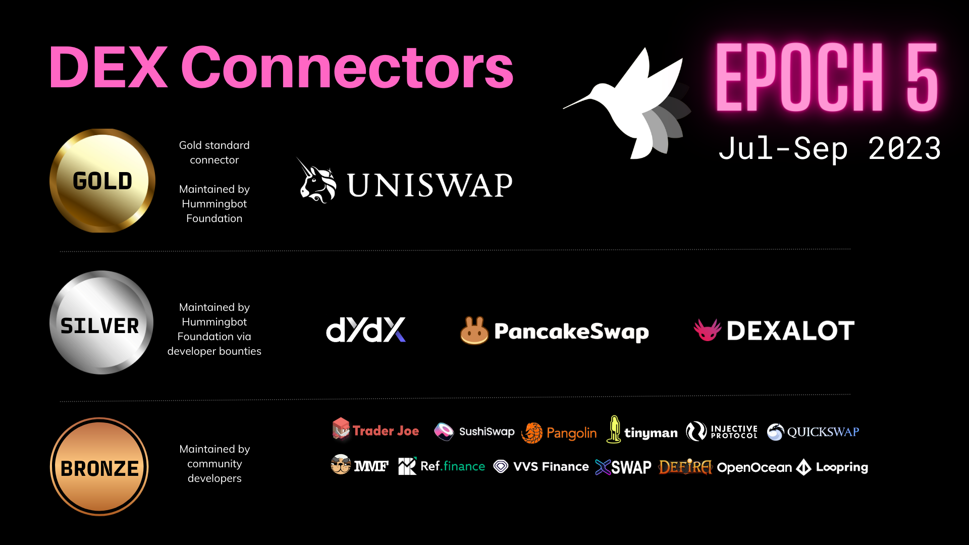 Bronze DEX connectors are not maintained by Hummingbot Foundation, but may be maintained by a community members. Each of the Bronze exchanges successfully garnered 100,000+ HBOT votes in the Epoch 5 poll and will have their connectors included and documented in the Q3 2023 Hummingbot releases.