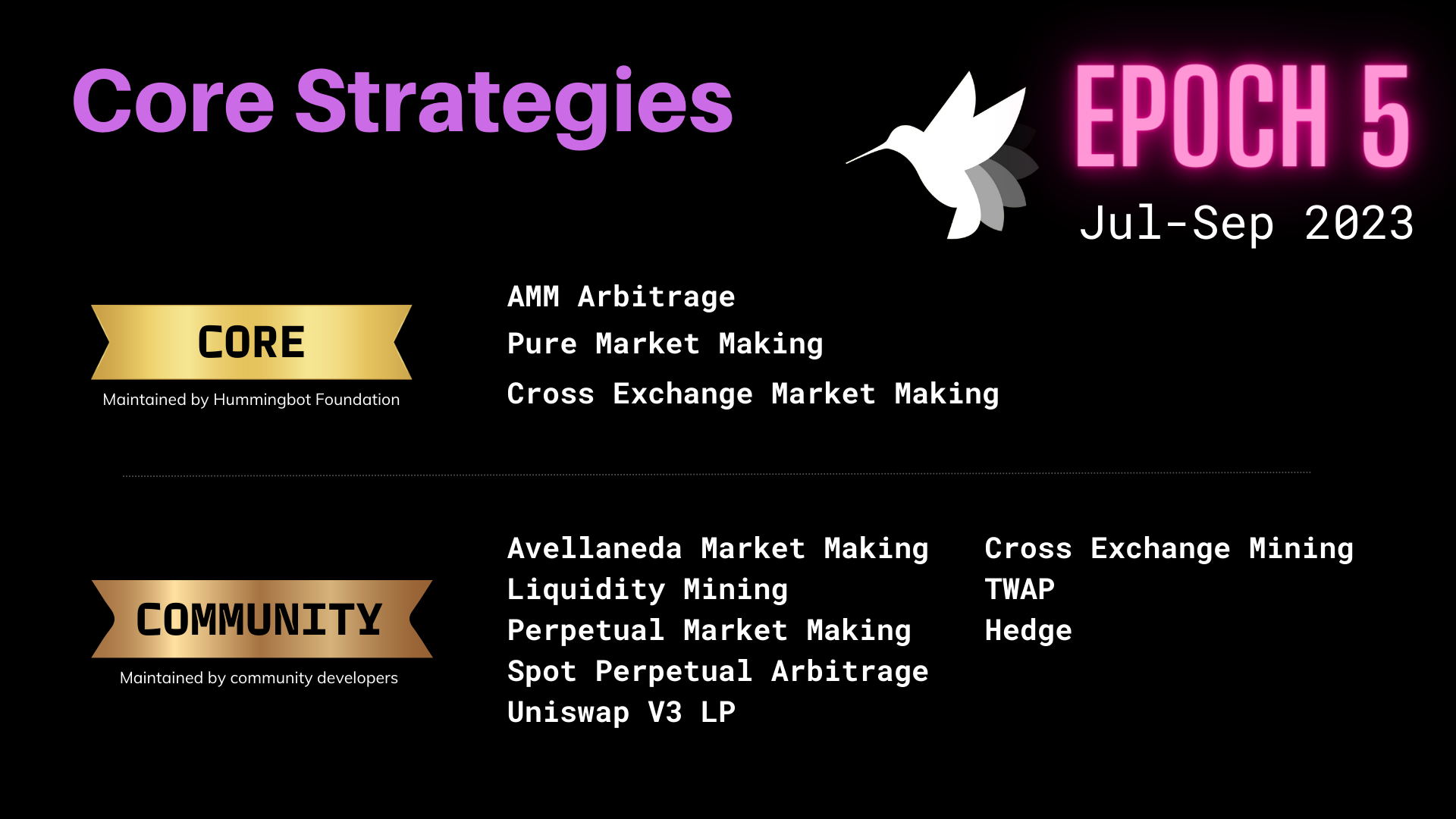 Community strategies are not maintained by Hummingbot Foundation, but may be maintained by a community members. Each of the Community strategies successfully garnered 100,000+ HBOT votes in the Epoch 5 poll and will have their connectors included and documented in the Q3 2023 Hummingbot releases.