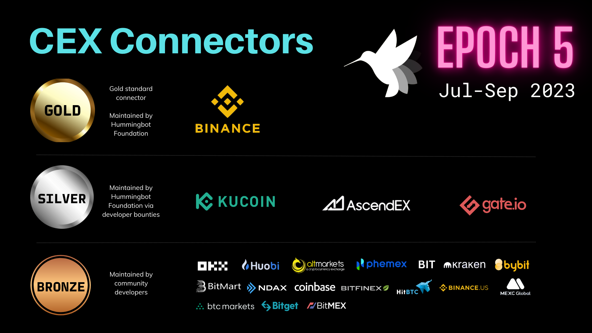 Bronze CEX connectors are not maintained by Hummingbot Foundation, but may be maintained by a community members. Each of the Bronze exchanges successfully garnered 100,000+ HBOT votes in the Epoch 5 poll and will have their connectors included and documented in the Q3 2023 Hummingbot releases.