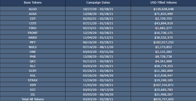 We are thrilled that over the past year, the platform has provided liquidity for 18 different token issuers, with 1,622 unique miners participating and earning rewards. Our decentralized market making community created order book depth and liquidity that resulted in $837mm of traded volume across the various liquidity mining campaigns!