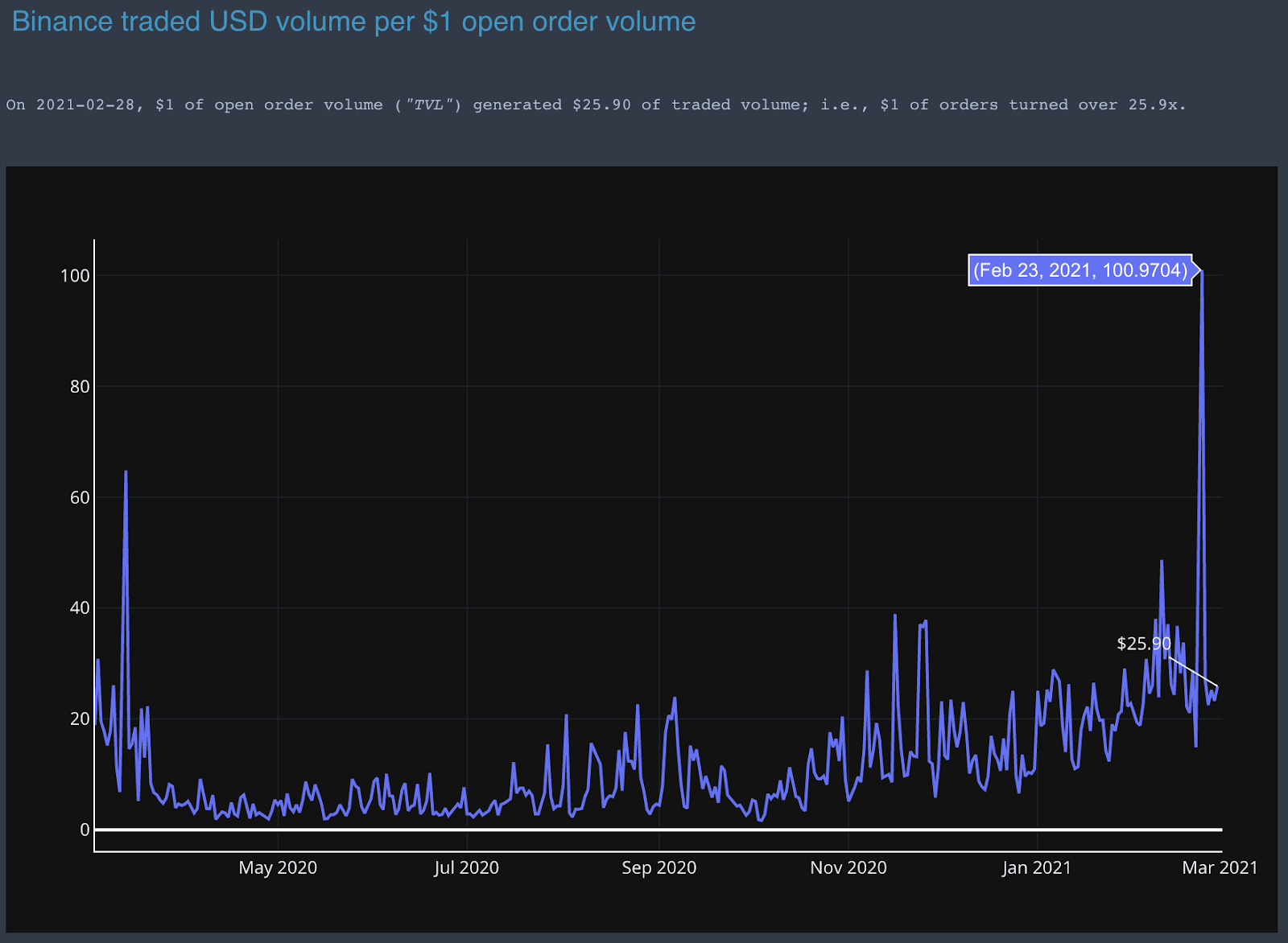 We introduced this metric this past month, which demonstrates the capital efficiency of liquidity in the Hummingbot miner system. This measure shows how many times, on average, Hummingbot miner orders are traded and turned over. For example, the most recent figure of $25.90 means that for every $1 of orders placed in the most recent trading day (February 28), on average, those orders were traded 25.9x, resulting in $25.90 of traded order volume.