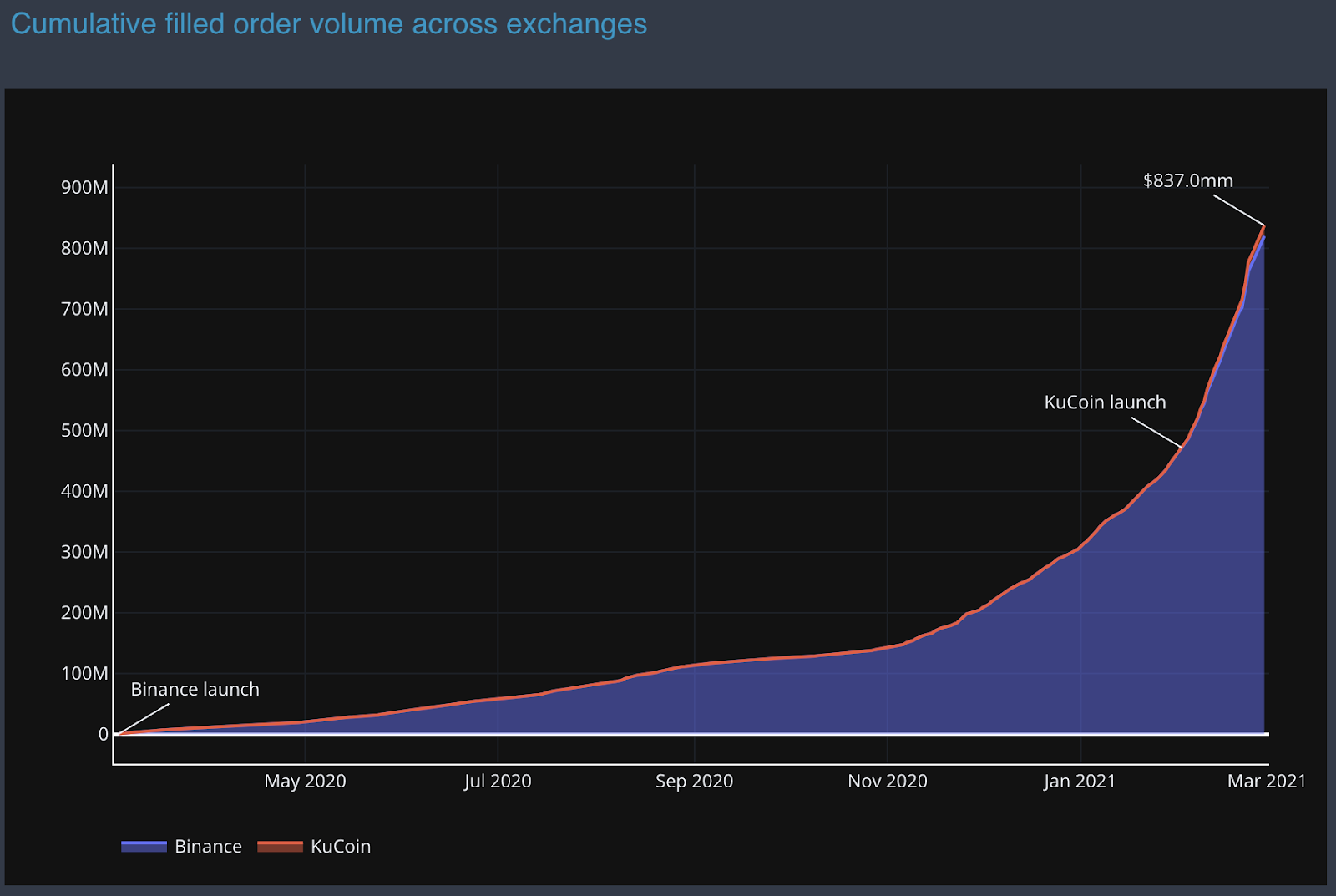 Since the launch of the Hummingbot Miner platform, miners have a cumulative trading volume of \(837m (\)819.8m on Binance and $17.3m on KuCoin):