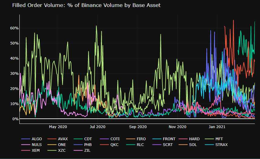 Filled volume as % of Binance totals¶