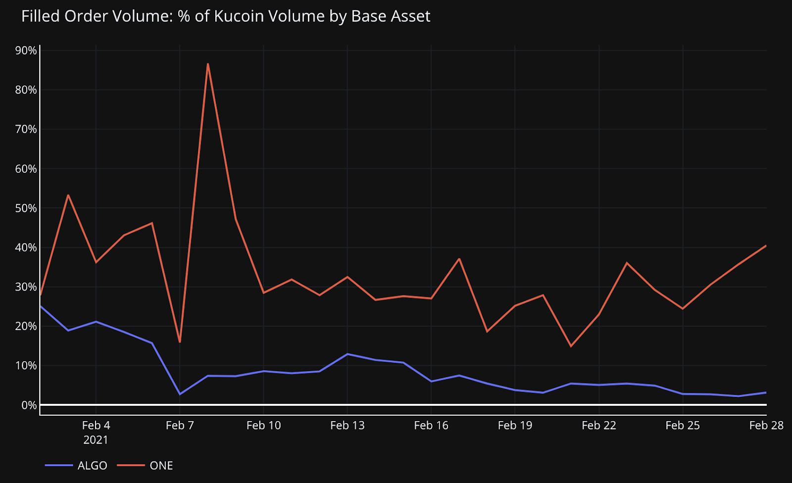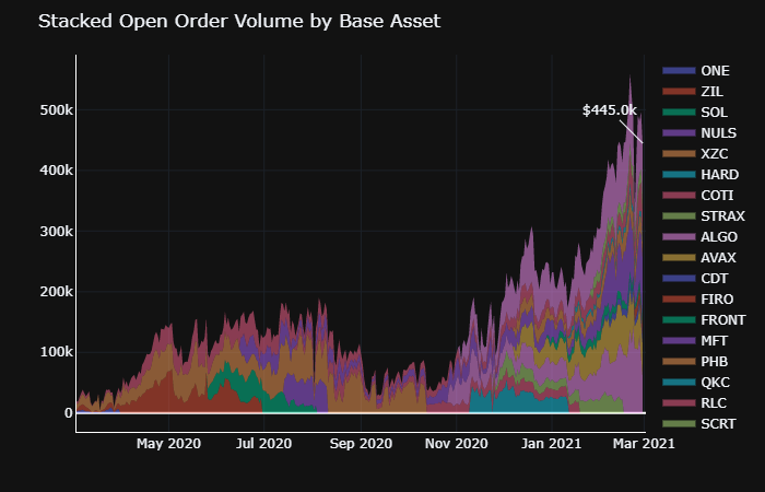 Hummingbot Miners were accounting for a meaningful amount of volume for Harmony ONE and Algo for the month, as much as 87% and 25%, respectively: