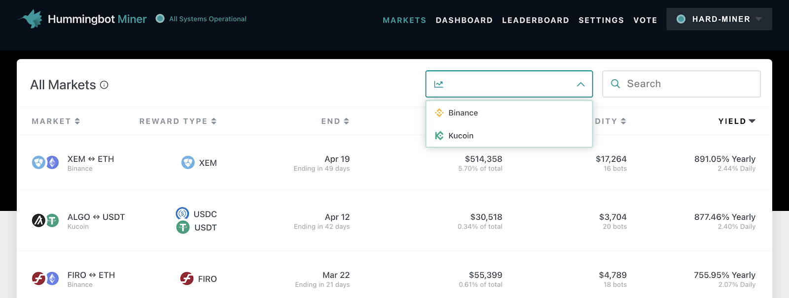 🏛 Token issuers: contact the team at partnerships@hummingbot.io to learn more about running liquidity mining campaigns on Kucoin, Binance.com, or to suggest the next exchange for us to integrate with!