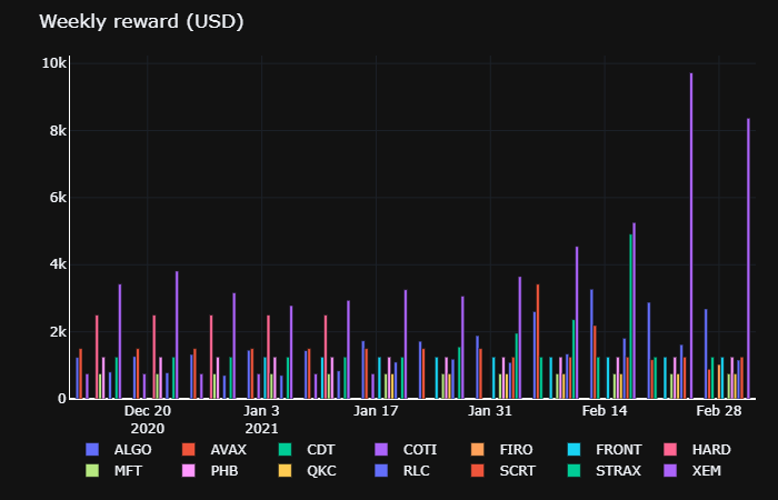 Miners have earned rewards in a combination of USDC, USDT, XEM, RLC, FIRO, USDT-TRON, ALGO, USDT ASA and USDC ASA (Algorand Standard Asset), STRAX, and AVAX. We continue to expand the capabilities of Hummingbot Miner to allow us to payout rewards in issuers’ own native tokens on their own blockchain.