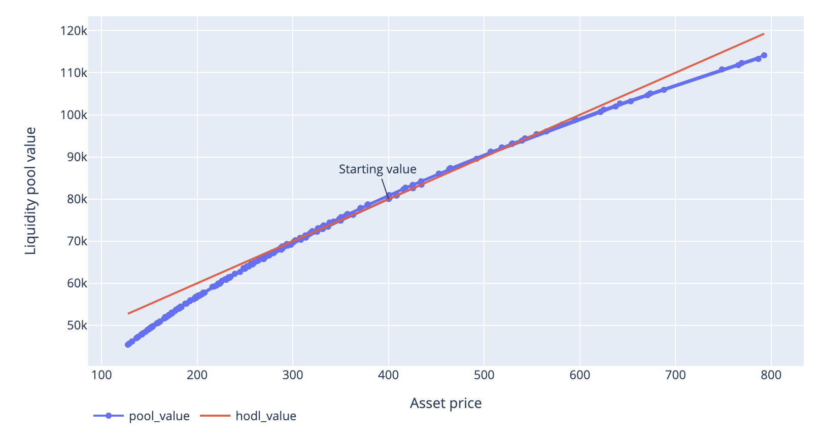 Hard to measure performance: monitoring profits and benchmarking for a liquidity provider is not so straight forward. If the asset price moves higher, the pool value goes up. Below is another way of looking at the liquidity pool value; rather than looking at the change only (from above), the following graph shows the absolute value of the pool (blue) after 200 simulated trades, compared to the value of the original assets (red) if there were no trades (i.e. HODL):