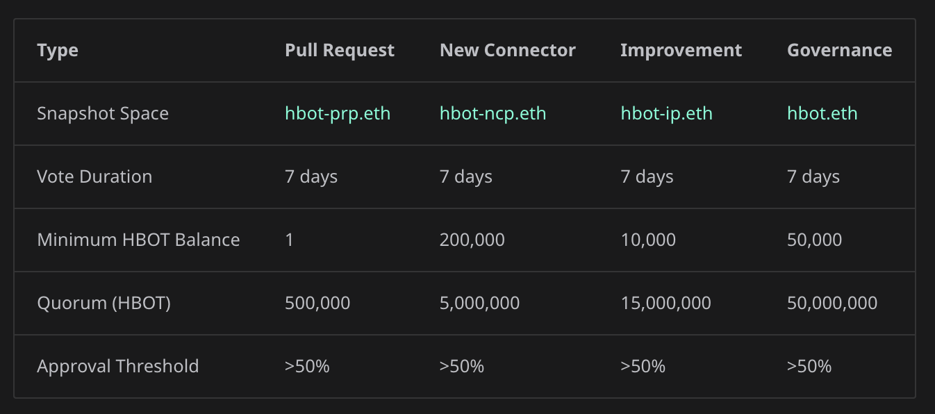 In addition, HBOT holders are expected to participate in quarterly Polls to determine which connectors are included in the codebase. Each quarter, there are three separate polls (CLOB CEX, CLOB DEX, and Gateway DEX), each lasting 14 days.