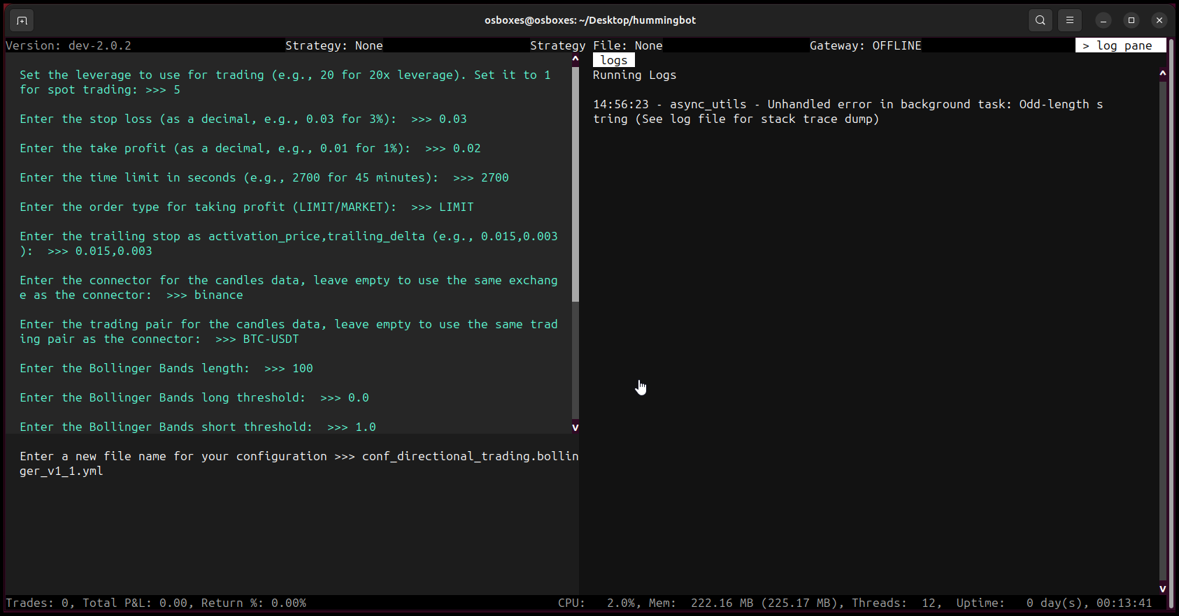 Note: The instance name will include hummingbot + the current date and time. This name appears in the top-left corner under Local Instances. If you need to manually attach to the Docker container, use this complete name to identify the bot instance.