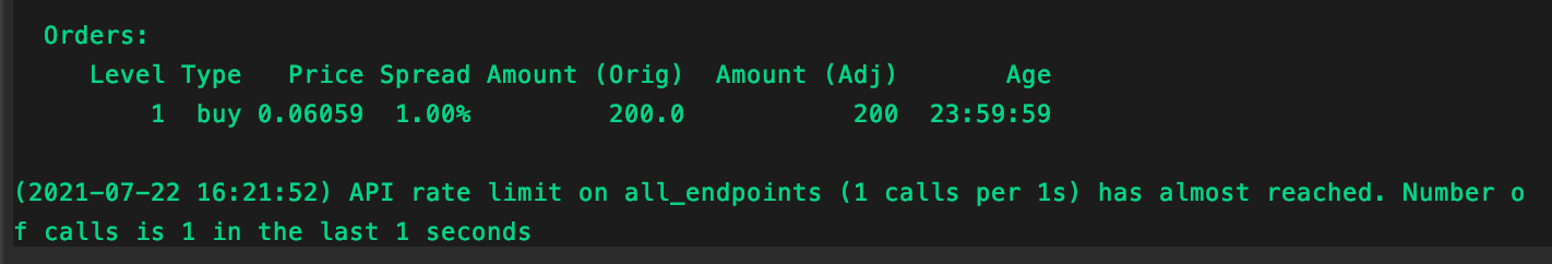 Some exchanges impose rate limits per account. When running multiple bots using a single account, rate_limits_share_pct users to set a certain percentage of the total limit to each instance. When the bot is near the allocated limit, Hummingbot sends a notification as a warning so users can adjust their configuration before the account is banned.