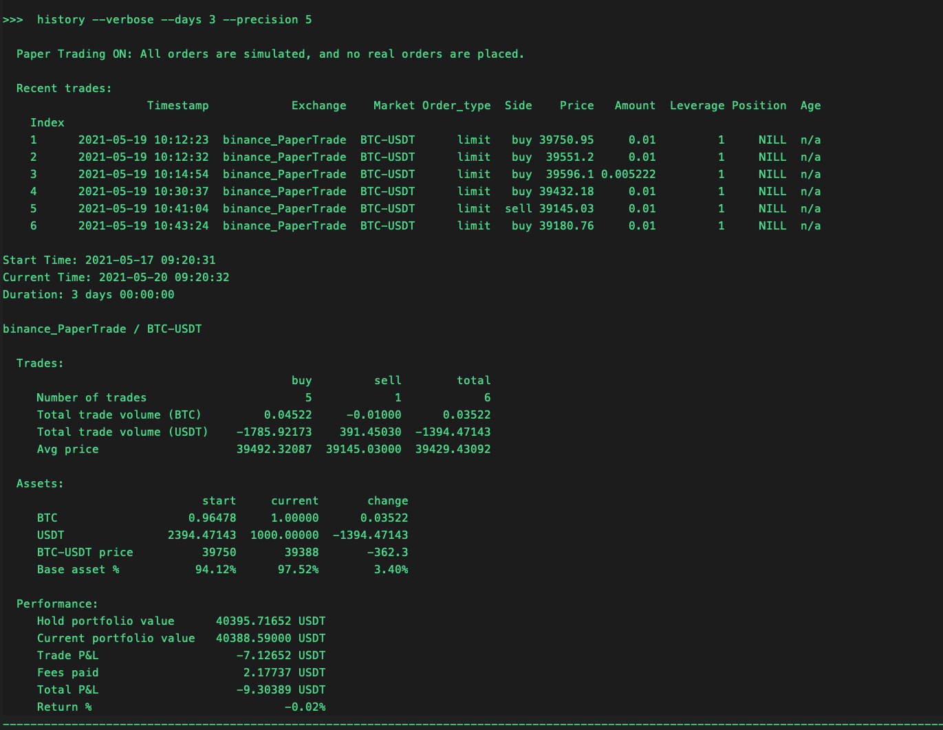The history command displays the current duration of total past trades, asset inventory and value, and market trading pair performance. Run history --verbose to see all recent trades.