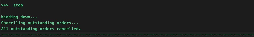 Run stop command to stop the running strategy. Doing this will also cancel all active orders.