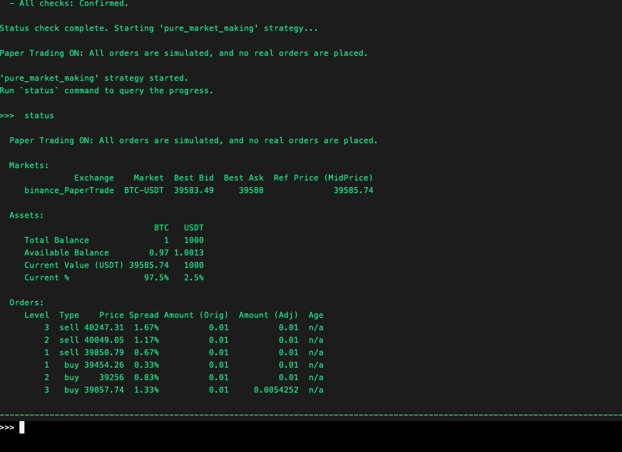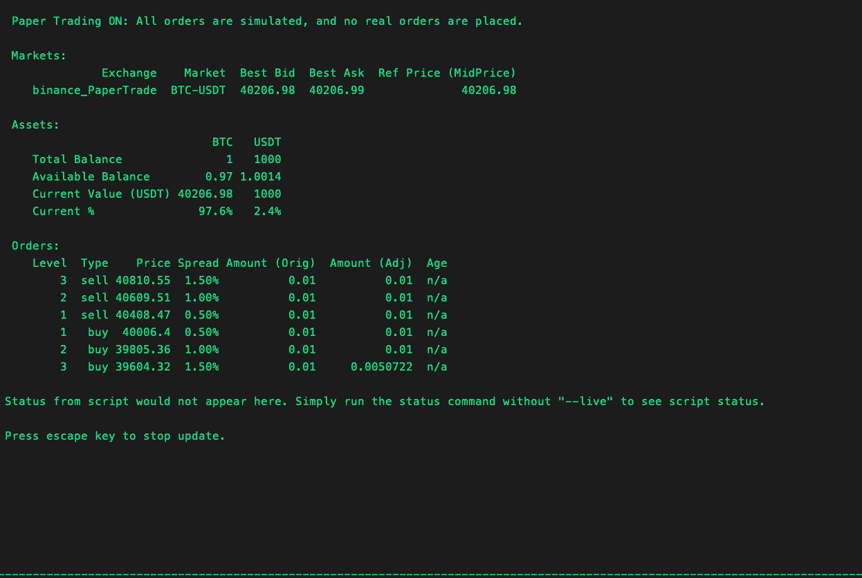 Run status command or CTRL+S to show the bot's current status. The output may differ depending on the running strategy, but generally, it shows the following information: