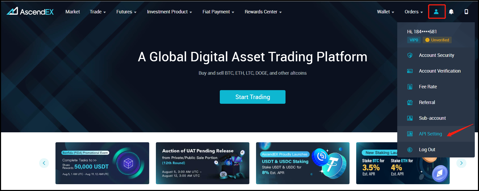 Log in to your AscendEX account using your PC and visit profile icon â [API Setting].