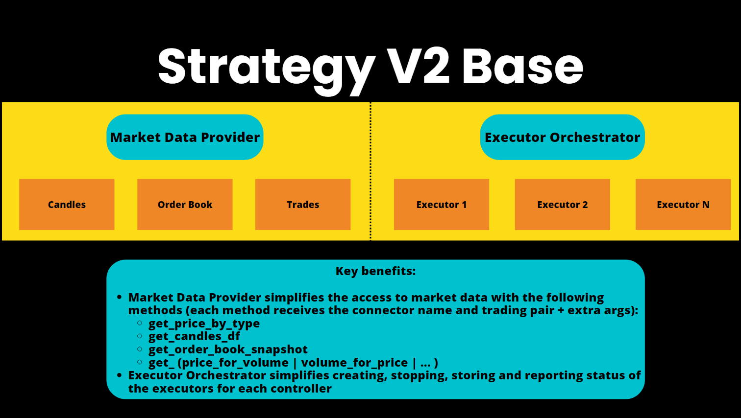 The entry point for StrategyV2 is a Hummingbot script that inherits from the StrategyV2Base class.