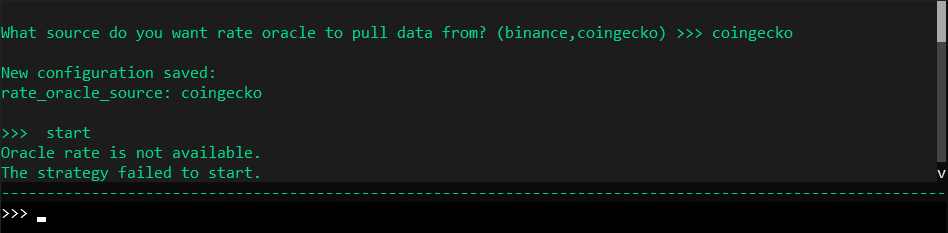 If you happen to start the bot and produce the error Oracle rate is not available, or ff the rate_oracle_source fails to show any price reference on your pair, you may change the oracle_source by running config rate_oracle_source and switch between Binance, Coingecko, Kucoin or Ascendex.